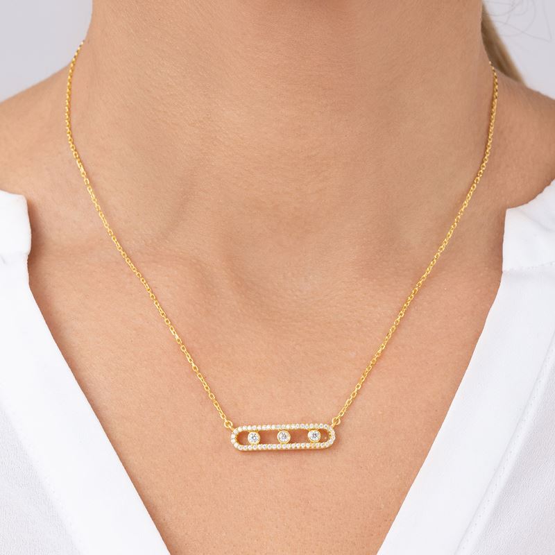 Material argint 925 rodinat, culoare auriu/placat cu aur 14k, greutate 4,45 g, lungime lant 43 cm/prelungire 5 cm, pietre zirconiu.